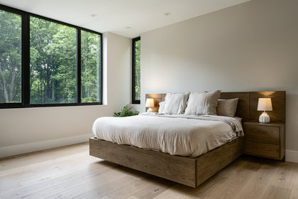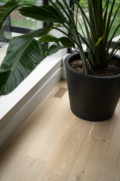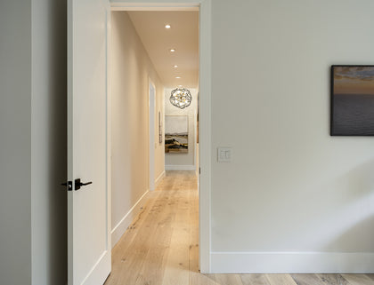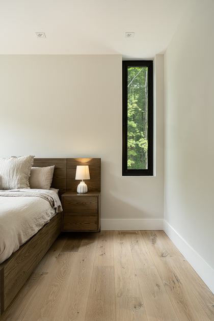 The choice of flooring was central to bringing the vision to life. To complement the clean interior design, the homeowners sought hardwoods that could lend a sense of warmth and character to each space. Northern Wide Plank’s Laguna North American white oak engineered wide planks, with their natural imperfections and sun-washed palette, aligned seamlessly with their aesthetic.