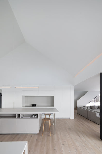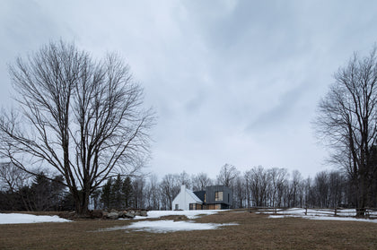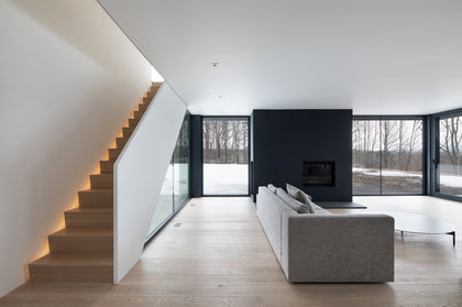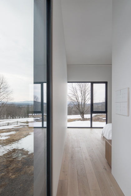 This once classic farmhouse in Quebec's Eastern Townships with its cedar-clad addition brings a striking contrast between old and new. The open, contemporary layout offers stunning views in both the interior and exterior. The minimal interior helps define the views of the great outdoors throughout all 4 seasons. The interior was kept predominately white, providing a perfect canvas for the homeowner’s art collection. Dover European oak wide plank adds subtle texture and warmth to the space, while staying in line with the minimal approach.