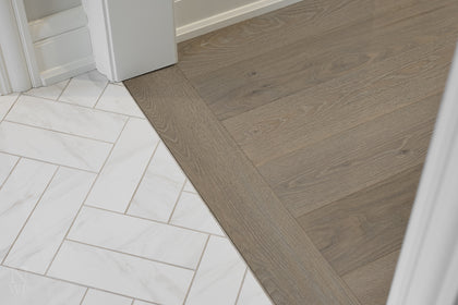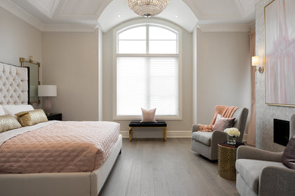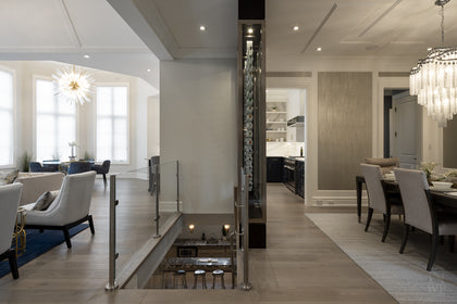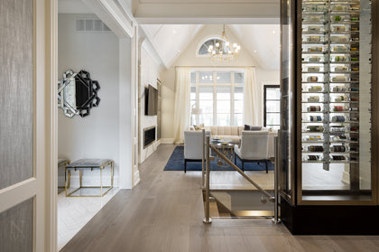 This luxury home was designed in the tradition of old world European with luxury finishes and details, seen in everything from the cabinetry to the furniture and the specialty wide plank flooring. Key details in this home make an impressive statement such as the glass wine wall that separates the dining room from the great room and the beautifully designed duotone kitchen that compliments the grey tones of the Tremblant wide plank flooring.