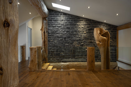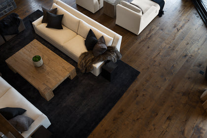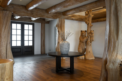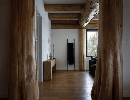 The confluence of natural elements made the choice of flooring pivotal. With its burnished brown tonality and rough-hewn bandsaw markings, Eldorado North American engineered white oak planks were considered the coup de coeur or "heart stroke."
