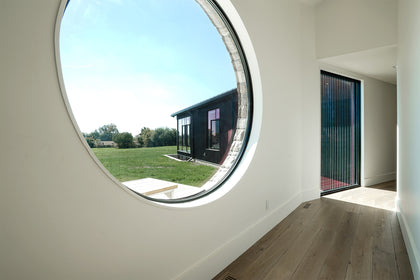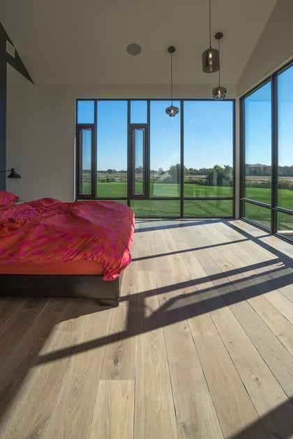 An outstanding modern home designed by Roundabout Studio has a really unique twist to it. Located in Ontario, Canada, this modern residence has stunning views of the rolling fields and other natural elements that go hand in hand with living in the country side. Located to the left of this home is the original farmhouse and barn that were settled here decades before. While the exterior is shadowed by mature oak trees and serene landscape the interior is a stark but stunning contrast to what you may expect for a farmstead. Step inside and you're met by a bright and refreshing atmoshpere with plenty of energetic vibe. Large windows throughout let the natural light flood in and reflect off the white walls, complimented by bright coloured accents. More contrast is seen when your eye meets the floor; a wide plank european oak that has been tumbled and distressed with handscraped edges for a more distinct effect. The grey tones of the floor collaborate with the modern elements while the rustic aesthetic compliments the more rural and natural side of this residence.
