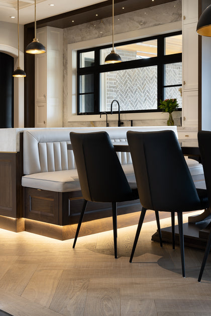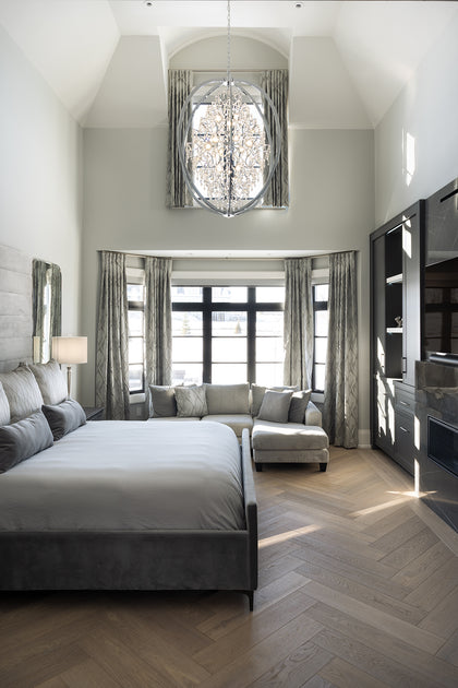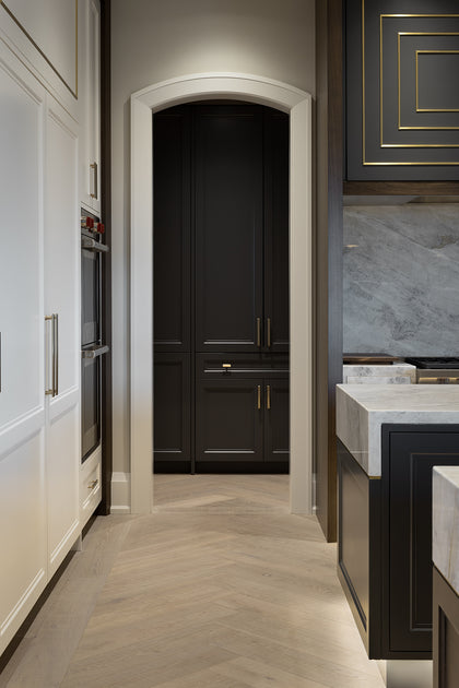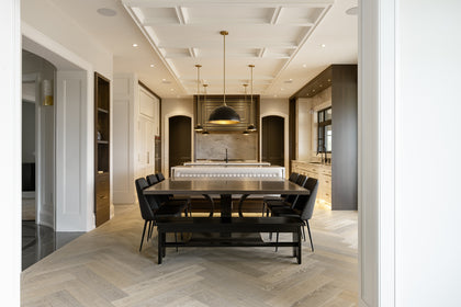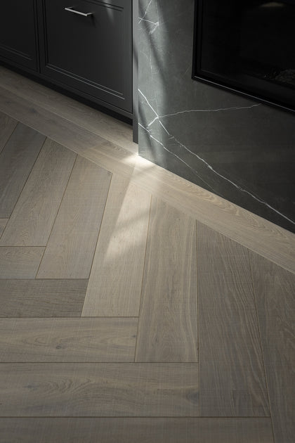 Bearing distant saw kerf markings and a warm grey colour palette, Nordic European Oak wide hardwood planks have decidedly heritage feel. Arranged in herringbone patterns in various spaces throughout this house, the hardwoods create interest while denoting a change in setting.