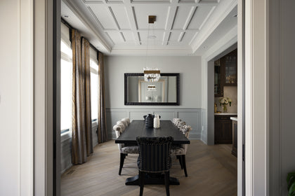 Upon Entry into the homes spacious foyer, the country house design theme unfolds, albeit through a contemporary lens, highlighted with clean lines punctuated by detailed focal points. Moving from one setting to the next, the space strikes a balance of natural beauty and contemporary elegance. This is evident in the traditional millwork and wall paneling juxtaposed by dramatic, modern chandeliers and lighting fixtures, giving the home a light and unique sensibility.