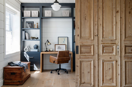 Inside, vintage pieces find new life, like the weathered chest in the office, complementing the traditional leather desk chair.