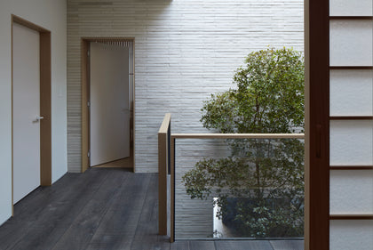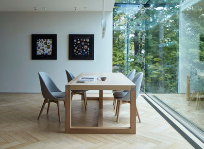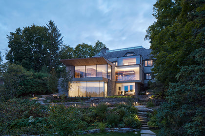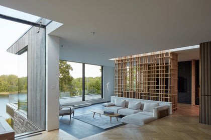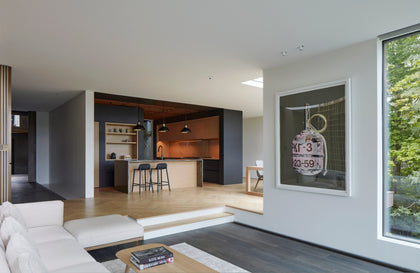 A palpable tranquility exists throughout the home. Elevated by the manipulation of light that acts as a main design element, an existing tudor revival house has been dramatically transformed. Custom wide-plank floors both contrast and complement the mix of bright and dark found as one travels from room to room. Transitioning to a herringbone design where the space calls for it. Rather than merely sitting on top of the land it was built on, this house exists as an extension of the nature that surrounds it; opting for variations in texture, material, and colour––exemplified by the different tones, patterns, and widths of flooring used in the home.