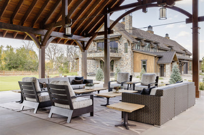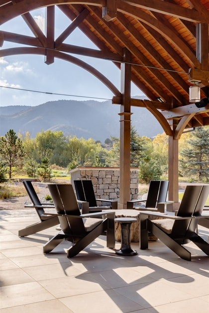 The exterior of this mountain retreat paints a picturesque scene, with stone facades, weathered wood, and iron accents seamlessly melding into the surrounding nature. Drawing inspiration from Colorado's rich ranching history, the architecture embraces elements like exposed beams and metal accents, creating a vintage charm that resonates throughout the property. A huge, vaulted ceiling pavilion, overlooking the rolling hills and fields, provides multiple covered gathering places, offering the perfect setting to absorb the scenic beauty. The first seating area features a cluster of Adirondack chairs around a natural stone table, while the other has comfortable couches and cushioned chairs, designed for easy conversation to be shared with friends and family.