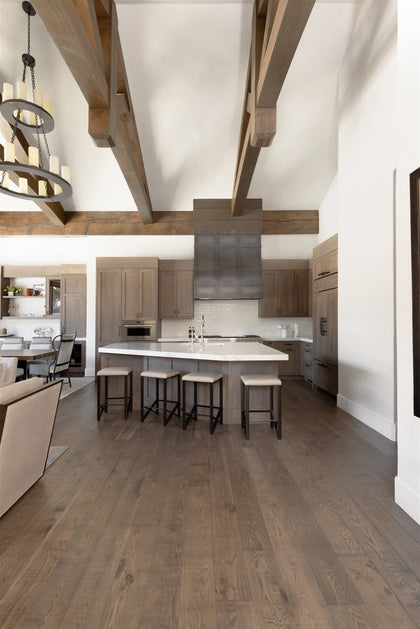 Nikki Holt, the visionary designer from Kimberly Timmons Interiors (KTI), conceptualized this mountain retreat as a living canvas, infusing every detail with a rich tapestry of Western influence. The project was driven by the homeowner's vision of a space that exudes tranquility, seclusion, and luxurious mountain living through the use of high-end materials, and the ever-captivating Rainier North American white oak flooring from Northern Wide Plank's Iconic Collection.