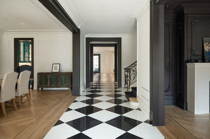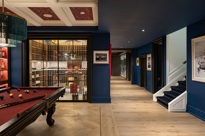 The flooring captures the essence of the project’s tenet—durable and understated yet brimming with character. It complements the home’s warm millwork, bold colours, and intricate details, such as the library’s coffered ceilings with wallpaper inserts. A sanctuary of intellectual elegance, pairs traditional craftsmanship with unique textures.
