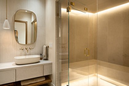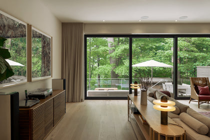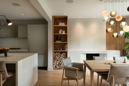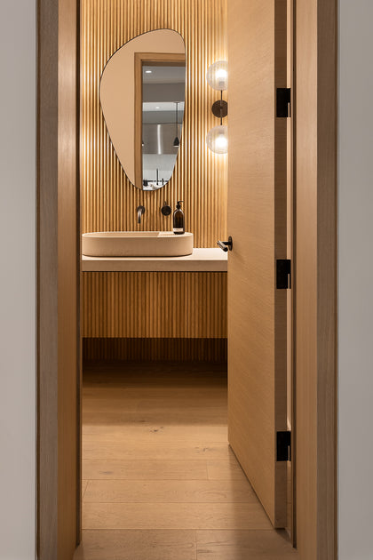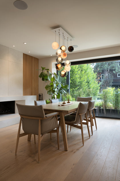 From the captivating forest views within the city to the playful tambour design in the powder room, which seamlessly extended to the dining room, every detail was meticulously curated. Thoughtfully selected furniture by Carl Hansen & Son, lighting from Blueprint Lighting, including the statement Bocci chandelier in the dining room, and limestone wash walls in the basement further elevated the design, adding an extra touch of artistry.