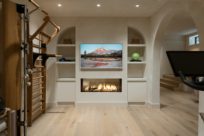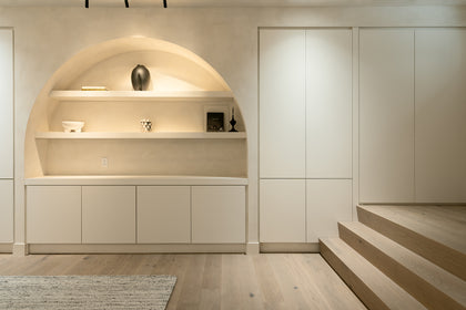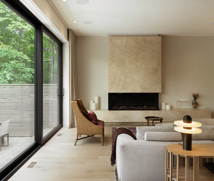 The evolution of this home began in the basement, where the space was completely reshaped to suit the specific needs of an active and growing family. A spa-like washroom doubles as a steam room and relaxation haven; cross the hall into the serene yoga and Pilates studio, complete with a 50-inch Flare fireplace, which connects the yoga studio and the family room with its double-sided see through design, as well as stylish oak Scandinavian fitness equipment. The limewash paint on the walls in the basement bursts with texture and light when enhanced by warm and strategic lighting. The flooring, the limewash and the grand arches all blend in calm harmony and are subtly reminiscent of an elegant home in Mallorca.