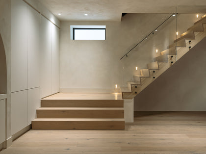 The introduction of NWP’s engineered white oak flooring shifted the project’s trajectory. The homeowners were captivated by its neutral tone, subtle oak “character” grain with organic knots, and brushed finish echoing the natural allure of the ravine. “The white oak floors were central to creating the natural aesthetic,” affirmed the homeowners, emphasizing the flooring’s vital role. Designer Catherine Stringer added, “when the homeowners saw the imagery and then large samples of the light oak flooring, the scope of work began to change. The premium colour, finishing, beauty, uniqueness, quality, and stair material capabilities were all the contributing factors to selecting Del Mar.”