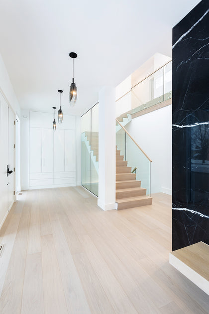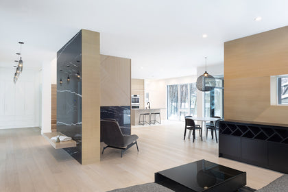 This custom home creates a modern zen aesthetic with pleasing minimal details combined with light wood surfaces and dark accents. Seen in the cabinetry, flooring and marble-clad wall, the combination of details and textures keep it simple, yet sophisticated.