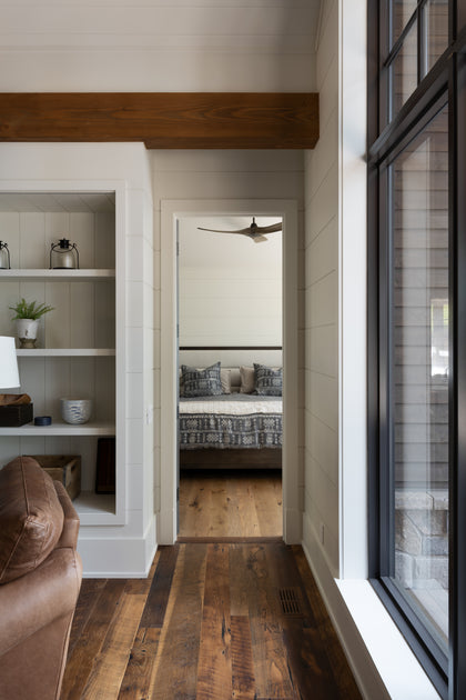 In the primary bedroom, a serene retreat unfolds. Wolf Creek reclaimed oak flooring is used in this space, harmonizing with the horizontal white wood paneling that reflects light from the large windows facing the lake. An ensuite washroom with a soaker tub continues the theme of elegance and relaxation, creating a personal haven within the cottage.