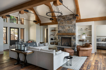 As you step inside the cottage, a narrative of design unfolds. Vaulted ceilings with exposed beams and metal chandeliers create an ethereal atmosphere, a blend of medieval charm and modern sophistication. Natural textures ground the space, while white wood paneling and Northern Wide Plank flooring tie it all together. The dining, kitchen, and living areas seamlessly flow into one another, fostering easy conversation and warm hosting.