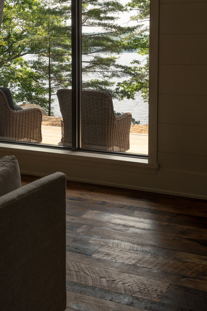Venture into Muskoka's tranquil waters, where a hidden gem awaits—a cottage designed to blur the lines between architecture and nature––only accessible by boat. Created by homeowners driven by a commitment to lasting elegance, this lakeside retreat is a canvas adorned with Northern Wide Plank's engineered hardwood flooring. A symphony of Mill Creek and Wolf Creek reclaimed oak resonates through the open spaces, weaving a narrative that celebrates the enduring beauty of Muskoka and the craftsmanship embedded in each plank.